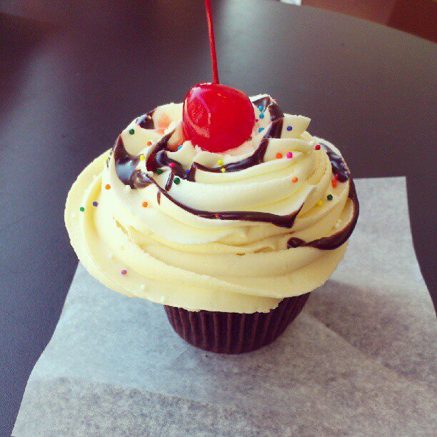 Sundae (pictured at left): Every bit as scrumptious as its name suggests, this cupcake consists of a chocolate cake topped with vanilla buttercream, sprinkles, and a maraschino cherry. Sundae is probably the most visually appealing of them all – but then again, they’re cupcakes. They’re all visually appealing.