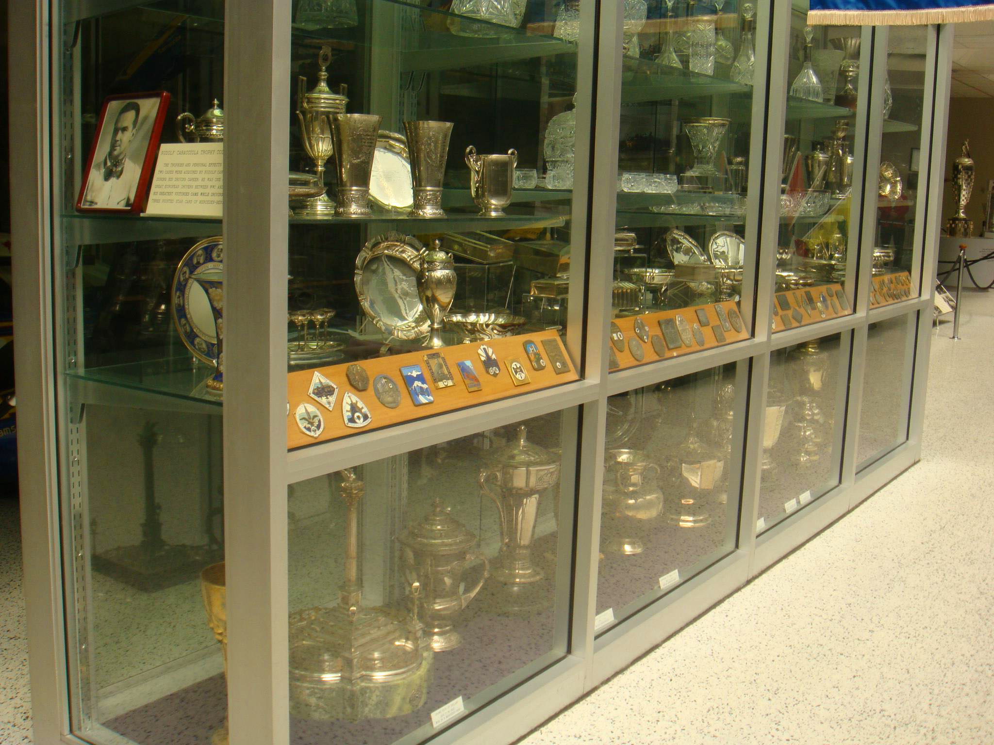 Rudi Carcacciola’s Trophies: This whole shelf holds the awards, trophies and commemorative statues that Rudi Caracciola won, including his wins from 1930s Grand Prix.