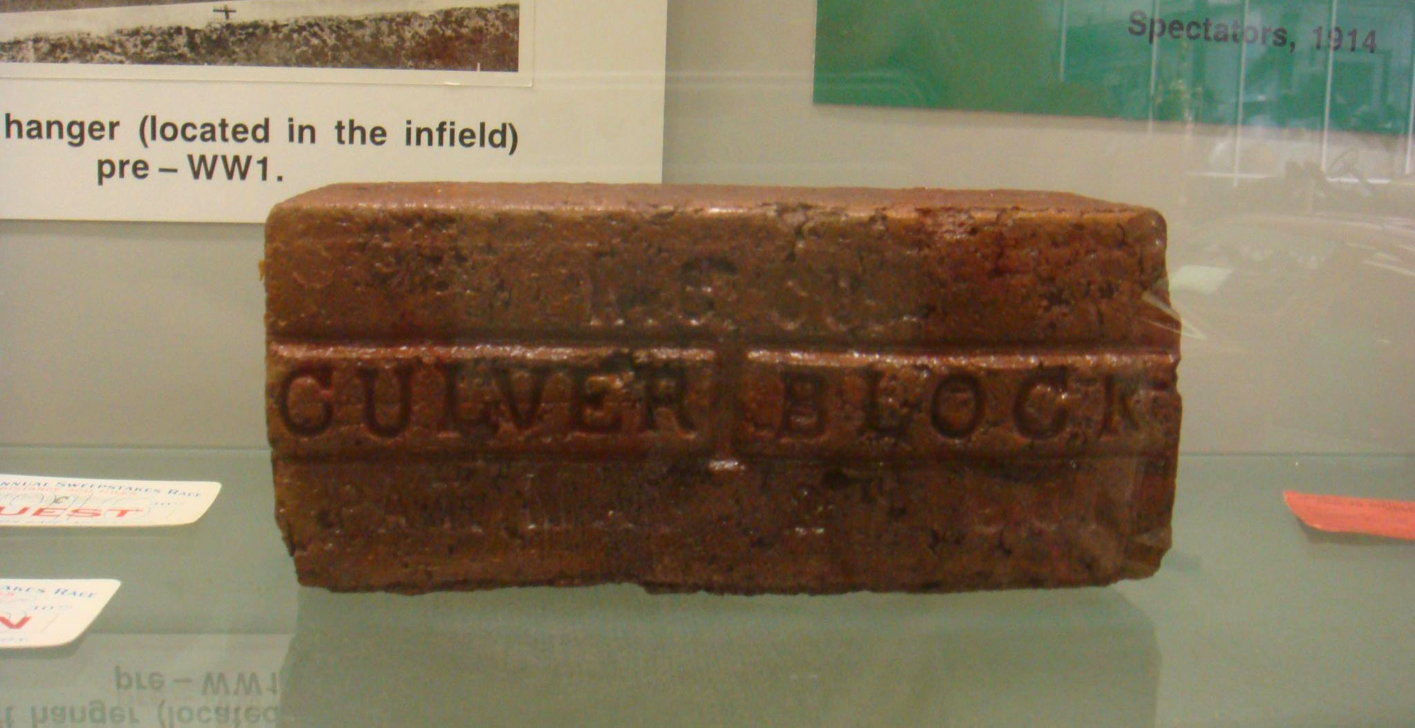 A Culver Block which was made by a Wabash Clay Company in Veedersburg, Indiana. These blocks were literally paving the way for The Brickyard. The inscription reads: W.C Co., Culver Block, Patented May 21, 1901.