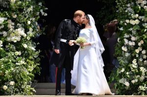 Prince Harry and Meghan Markle mark their first official kiss as husband and wife.